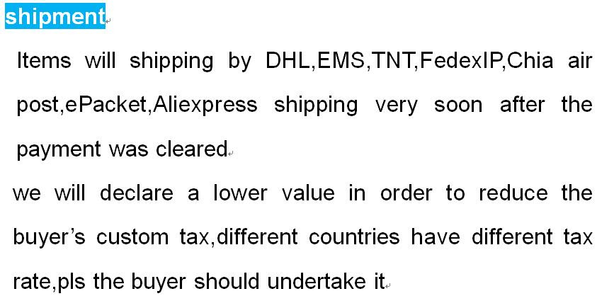 If the product you receive is not as described or low quality, the seller promises that you may return it before order completion (when you click "Confirm Order Received" or exceed confirmation timeframe) and receive a full refund. The return shipping fee will be paid by you. Or, you can choose to keep the product and agree the refund amount directly with the seller.N.B.: If the seller provides the "Longer Protection" service on this product, you may ask for refund up to 15 days after order completion.