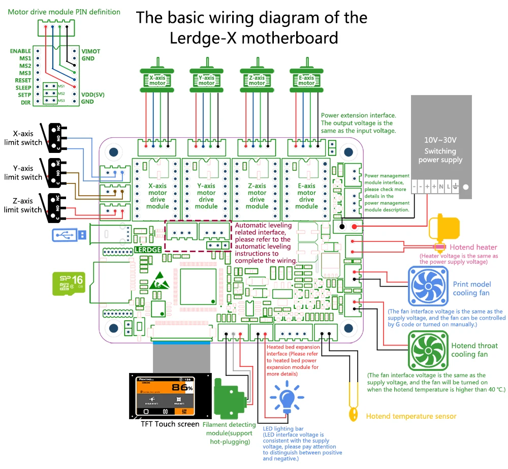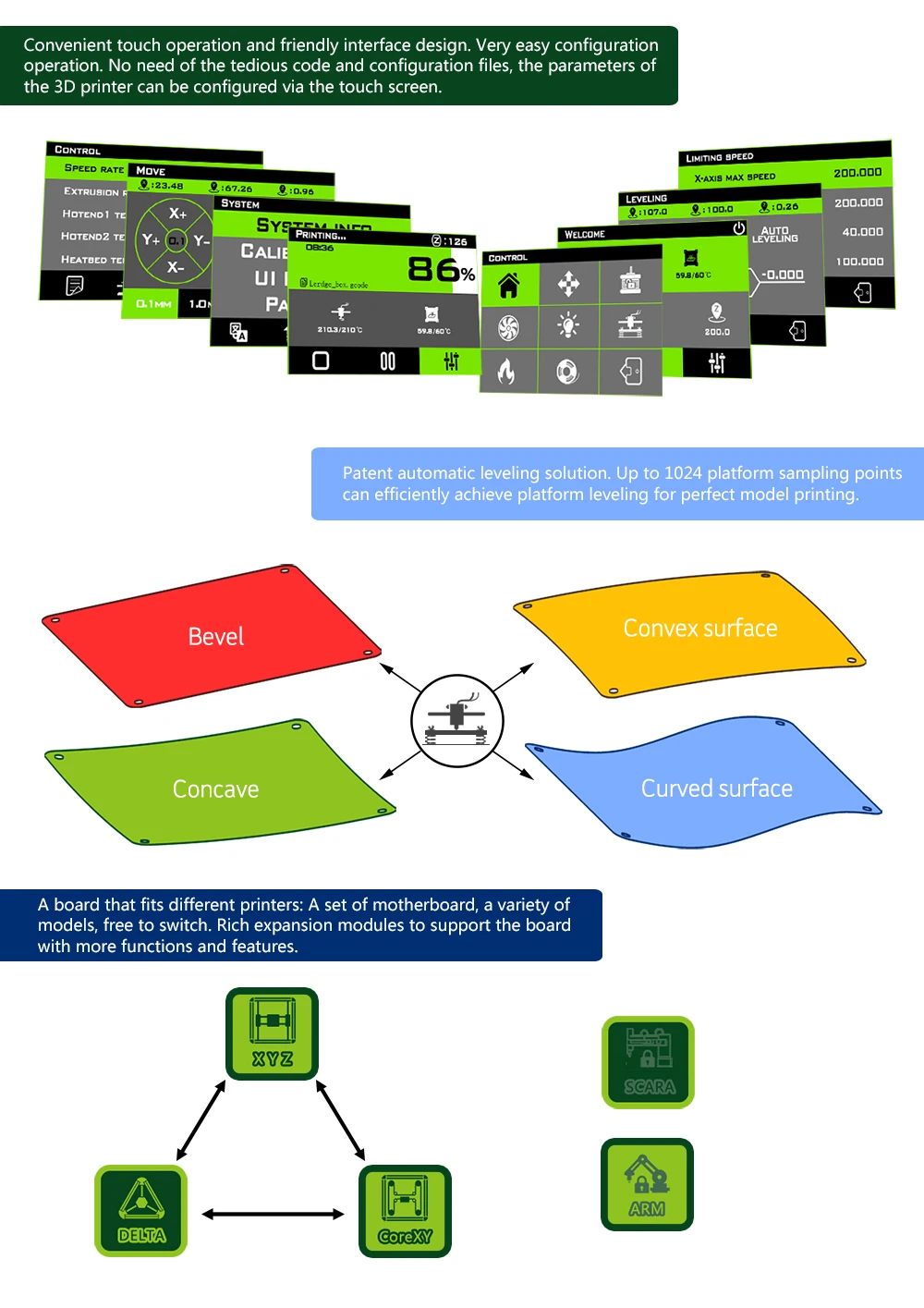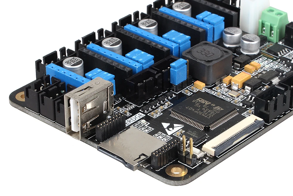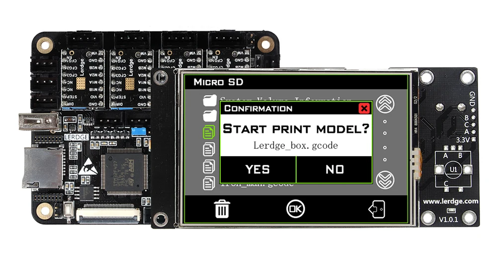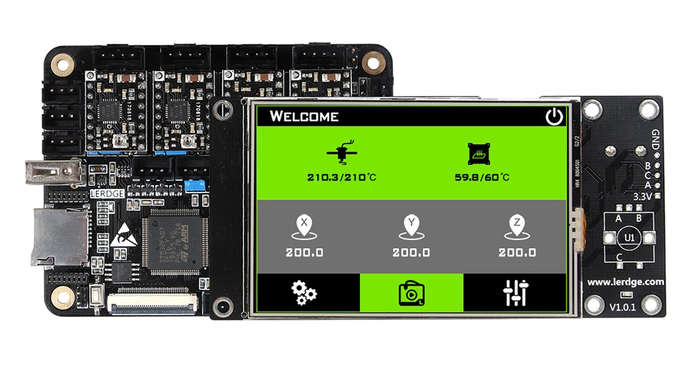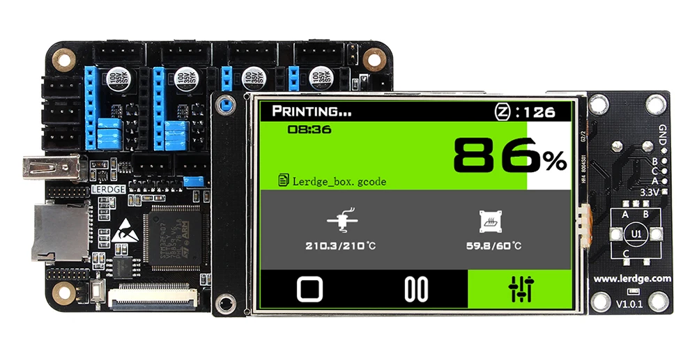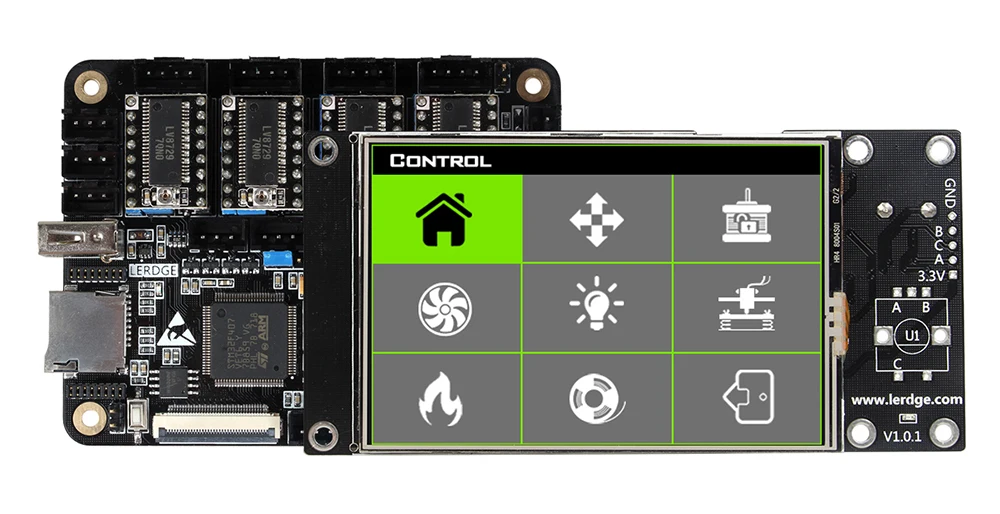 Among Lerdge 3D Printer boards, Lerdge-X is a highly integrated control board designed for the Small 3D Printers, Educational 3D Printers and Entry-level 3D Printers. The mainboard uses a 32-bit coretx-M4 Core control unit, strong and stable performance, feature-rich, price concessions. With 3.5-inch full-color IPS LCD touch screen, it brings the simple and smooth operation. The motherboard uses an open interface, are free to match different motor drive modules (A4988, DRV88225, LV8729, TMC2100, TMC2208 and external driver, etc.) to meet different customer needs. Motherboard optimizes limit switch connection, and with a comprehensive line protection design.